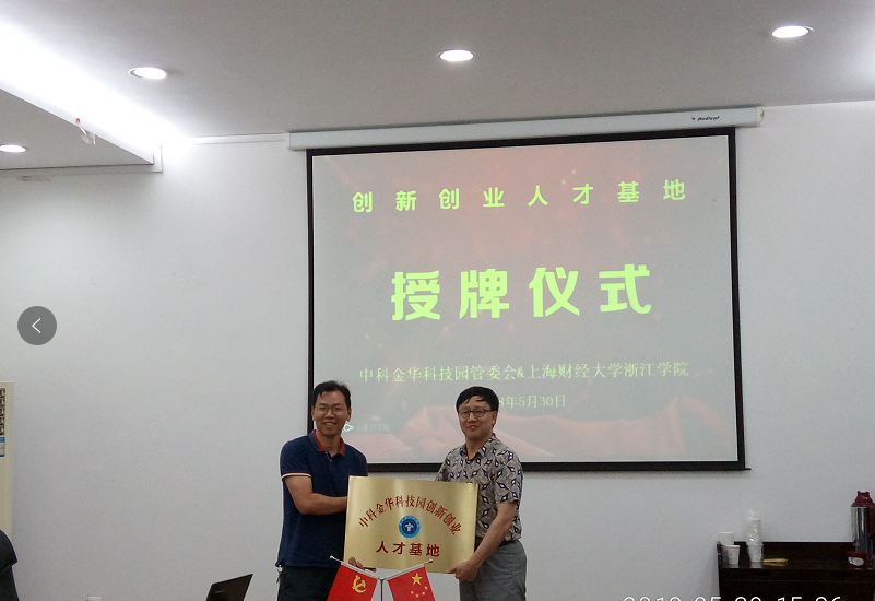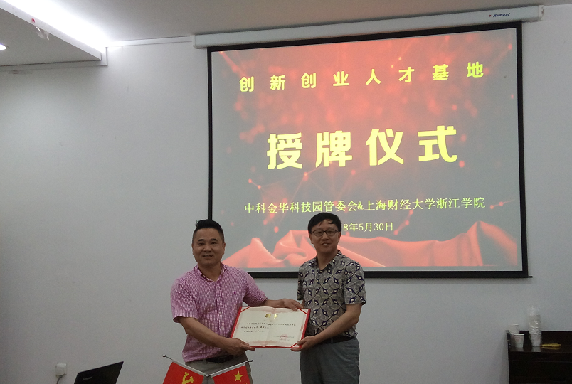 之后,由朱卫锋代表中科金华科技园管委会向上海财经大学浙江学院授“中科金华科技园创新创业人才基地”铜牌。