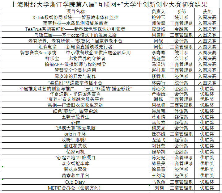 从2022年3月18日发布比赛预通知以来,同学们积极申报,共收到作品336份,本届“互联网+”大赛初赛聘请了全国十佳创新创业导师团中央中国青年创业导师傅许坚、金华可创科技有限公司总经理浙江省创业风险投资行业协会金华分会常务副秘书长肖云华和全国大学生创业实践联盟专家委员浙江师范大学创新创业学院办公室主任陈乃启三位专家作为评委,经过认真的筛选,按照“互联网+”比赛要求,最终遴选出30份作品,其中,前12个项目入围决赛,争夺金、银、铜奖,后18个项目获得优胜奖。现将评审结果公示如下: