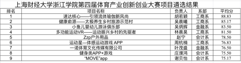 本次参赛共9个项目,专家们经过评审,最终遴选出3个项目推荐省赛,他们分别是《速达核心——引领流体瑜伽新风尚》、《健康俞源——太极养生乡村旅游示范村》和《小鱼儿婴幼儿游泳俱乐部》,现将遴选结果予以公示如下: