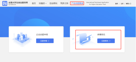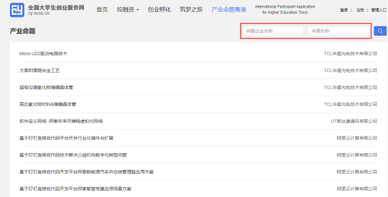 第三步:访问【全国大学生创业服务网】(网址:https://cy.ncss.cn/)—产业命题赛道—参赛报名—产业命题赛道版块,按照命题企业名称及命题名称搜索命题,浏览命题内容及答题要求。