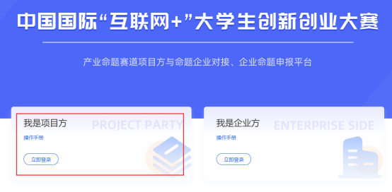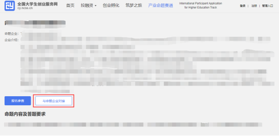 第四步:点击“与命题企业对接”,跳转至【产业命题赛道命题企业对接、企业命题申报平台】,注册登录后与命题企业对接咨询,进一步了解命题具体解答要求、获取企业支持等(详见附件3)。注:此平台账号非大创网账号,须重新注册。