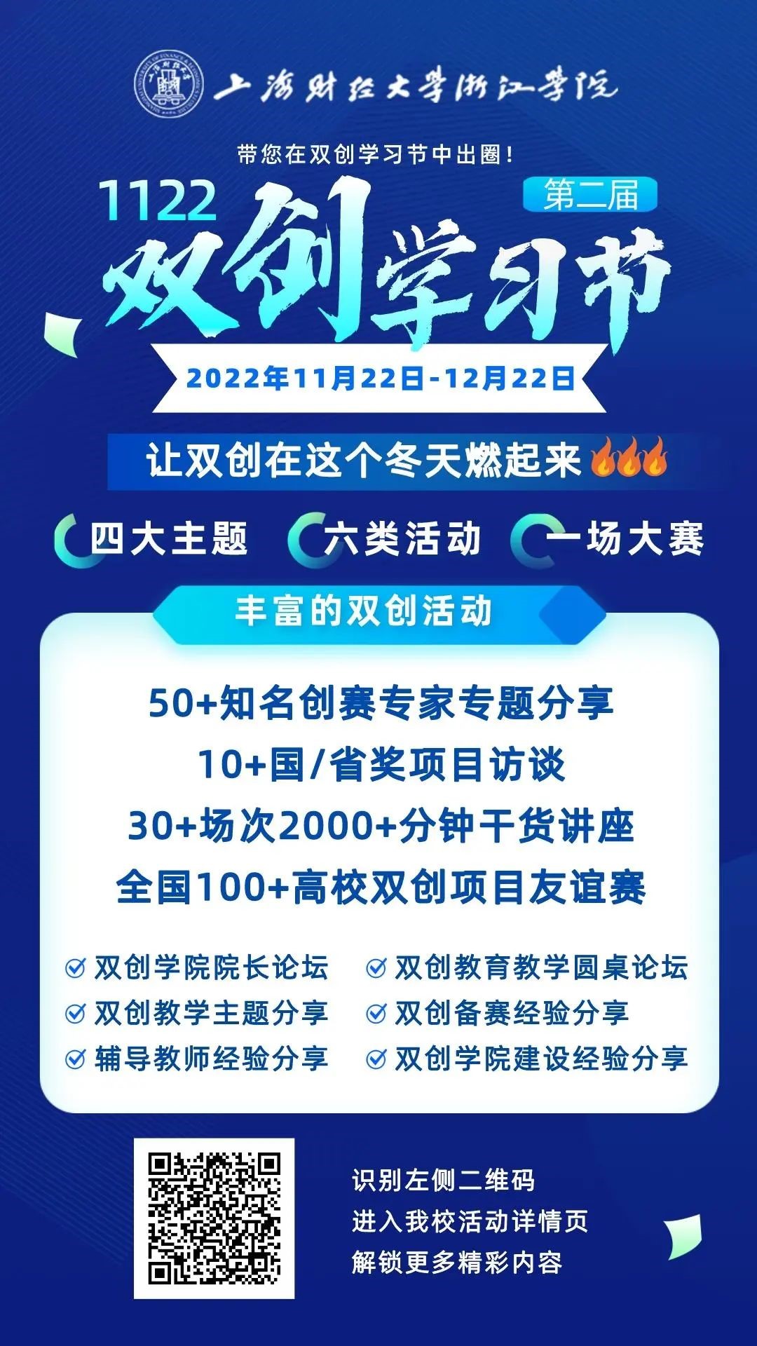 为贯彻落实党的二十大精神“科技是第一生产力,人才是第一资源、创新是第一动力”,按照党中央、国务院决策部署,实施科教兴国战略,推动教育数字化,营造良好创新创业生态环境,激发全社会创新创业活力,有效整合资源完善模式,培育创新文化,形成大众创业、万众创新的生动局面。为加快实施创新驱动发展战略,也为更好落实国办(2021)35 号文,并协助和支持各高校双创工作,再次强化推进支持大学生创新创业,持续办好创新创业大赛。正值第八届“互联网+”大赛完美收官,第九届大赛已拉开帷幕之际,创业学院邀请广大财浙创业学子参加米有校园举办的“第二届1122 双创学习节”,该活动纯免费公益,时间为2022 年 11 月 22 日-12 月 22 日,起于小雪,终于冬至,共持续 31 天。